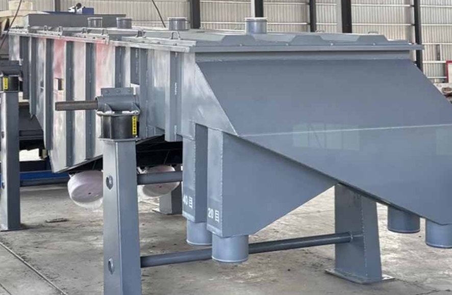 直线振动筛采用双激振器驱动,当两台激振器做同步、反向旋转时,其偏心块所产生的激振力在平行于电机轴线的方向相互抵消,在垂直于电机轴的方向叠为一合力,因此筛机的运动轨迹为一直线。其两电机轴相对筛面有一倾角,在激振力和物料自重力的合力作用下,物料在筛面上被抛起跳跃式向前作直线运动,从而达到对物料进行筛选和分级的目的。可用于流水线中实现自动化作业。具有能耗低、效率高、结构简单、易维修、全封闭结构无粉尘溢散的特点。高则筛分目数400目,可筛分出7种不同粒度的物料。